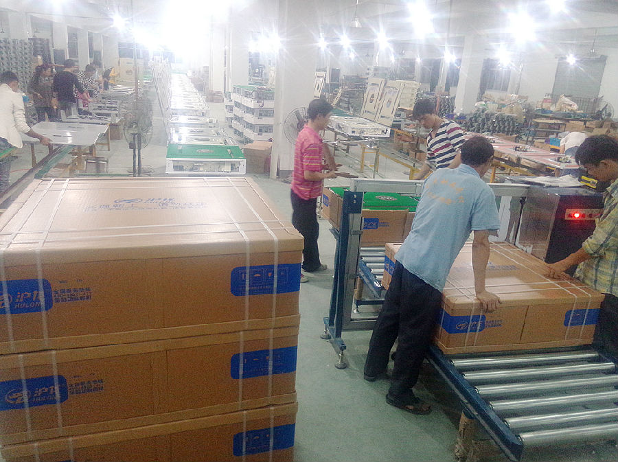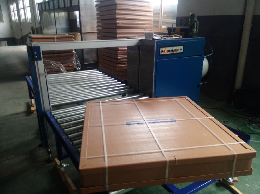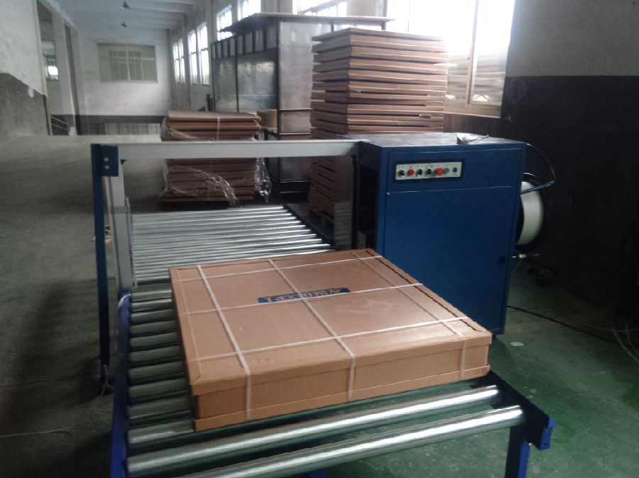 全自动打包流水线(13800元/套):由1台全自动打包机、2条无动力滚筒线组成。占地面积:3米X2米;耗电量1千瓦/时、三相四线;日产量:2人打包200-300台/8小时、4人打包350-500台/8小时。打包带的接头在纸箱的侧面更牢固。