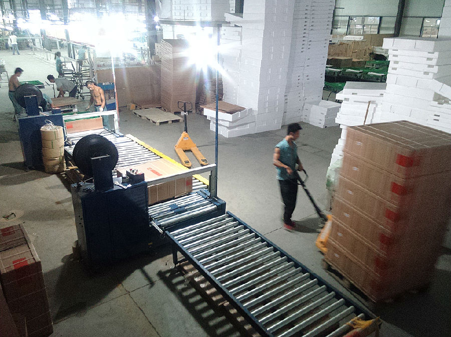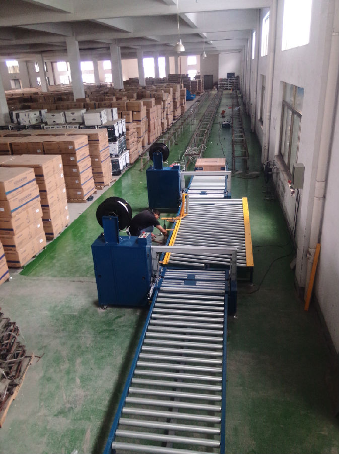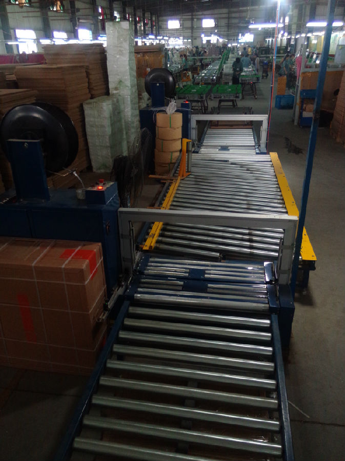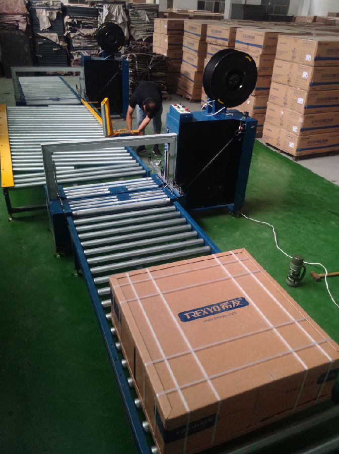 无人化自动生产线(68000 元/套):由2台无人化全自动打包机、1条有动力滚筒线、2条无动力滚筒线组成。耗电量2千瓦/时、三相四线;占地面积10米X2米;日产量:4人打包500-600台/8小时、5-7人打包600-800台/8小时。打包带的接头在纸箱的侧面更牢固。